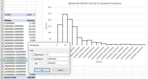 Попробуем уменьшить размер интервала группировки. Для начла уменьшим в два раза (рис. 6.21).