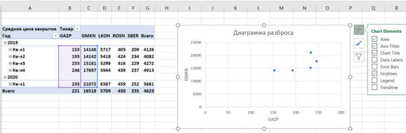 Series X Values диапазон значений в колонке GAZP (без общего итога).