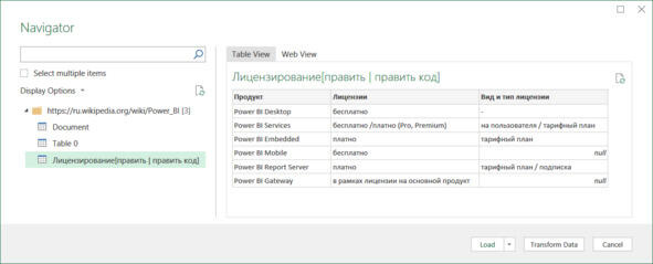Задание. Загрузите в Excel таблицу «Лицензирование» из статьи «Power BI» на сайте Википедии и ознакомьтесь с результатами.