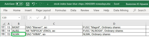 Чтобы узнать тикер, рассмотрим список компаний из индекса голубых фишек (рис. 3.37). Выбираем последнюю строку списка. Нас будет интересовать биржевой тикер НЛМК. Это четыре английские буквы:
