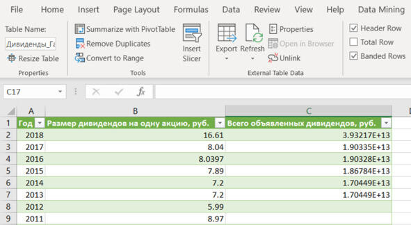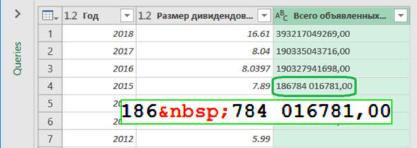А в пустых ячейках появилось слово NULL. Это не число «ноль». Это «ничего», то есть «данные отсутствуют». Скорее всего, этот столбец добавили в 2013 году. А, может быть, до 2013 года действительно не объявляли размер дивидендов.