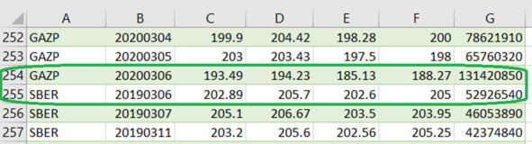 На границе данных по Газпрому и Сбербанку лишних строк не наблюдается.