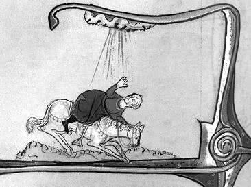 Второй возможный источник пародии это обращение апостола Павла. Как рассказывается в Деяниях апостолов (9:35), когда Савл, тогда еще гонитель христиан, приближался к Дамаску, с неба внезапно воссиял свет. «Он упал на землю и услышал голос, говорящий ему: Савл, Савл! что ты гонишь меня? Он сказал: кто ты, Господи? Господь же сказал: Я Иисус, которого ты гонишь». Хотя в Деяниях ни слова не сказано о том, что Савл (так его звали, пока из смирения он не сменил имя на Павел, от «paulus» «малый») ехал в Дамаск верхом, на многочисленных средневековых изображениях его конь, ослепленный небесным светом, падает оземь (29).