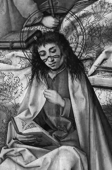 Примерно тогда же Отцов Церкви, евангелистов и прочих святых, причастных к ученым занятиям, стали изображать в очках для чтения (6). Этот ценный инструмент, позволявший интеллектуалам, растерявшим былую зоркость, продолжать свои штудии, был изобретен в Италии в конце XIII в. и оттуда распространился по Европе. В результате он стал восприниматься как атрибут учености и книжной культуры, а посему вошел в иконографию главных христианских мастеров слова евангелистов и богословов (правда, со временем очки стали использоваться и в негативном смысле как символ духовной слепоты грешников, а порой и самих демонов). Однако на первых порах мастера, которые водружали древним святым на нос очки, не могли не знать, насколько это недавнее изобретение. Представим себе, что сегодня художник, чтобы подчеркнуть мудрость того же Иеронима, решил бы изобразить его в цифровых очках Google Glass.