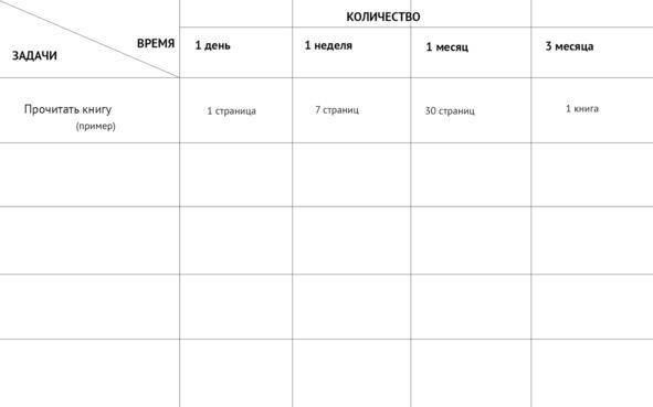 И таким образом достраиваешь каждую колонку, выписывая в неё то количество действий, которое должен выполнить в этот срок. Крайняя правая колонка будет обозначать крайний срок твоей цели.