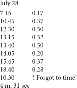 He said, Youve only got to multiply by seven. That makes half an hour a week. Twenty-six hours a year. Of course shipboard life isnt quite average. Theres more drinking between meals. And beer keeps on repeating. Look at this time here one minute, fifty-five seconds. Thats more than the average, but then Ive noted down two gins. Theres a lot of variations too I havent accounted for[247], and from now on Im going to make a note of the temperature too. Heres July twenty-fifth six minutes, nine seconds n.c. that stands for not complete. I went out to dinner in BA and left my notebook at home. And heres July twenty-seventh only three minutes twelve seconds in all, but, if you remember, there was a very cold north wind on July twenty-fifth and I went out to dinner without an overcoat.