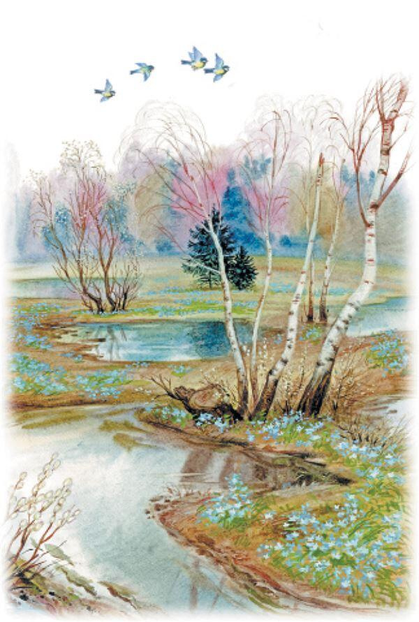 Полетела Зинька на реку. Летит над полем, летит над лугом, слышит: всюду ручьи поют. Поют ручьи, бегут ручьи все к реке собираются.