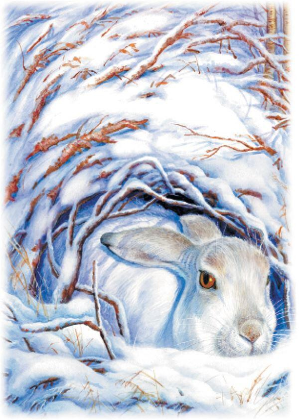 Вдруг из-под снега зверь Сам весь белый, уши с чёрными точками держит торчком.