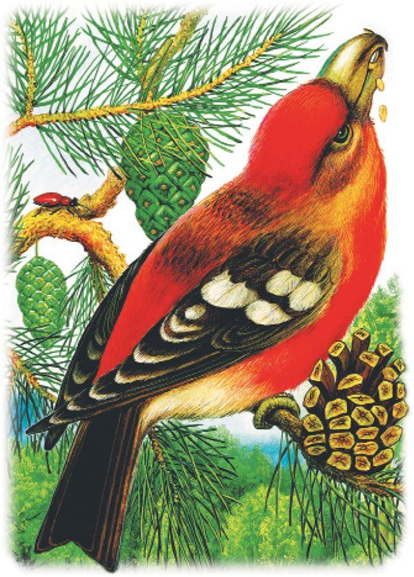 Клёст ловко поддел кривым носом чешуйку еловой шишки и достал семечко.