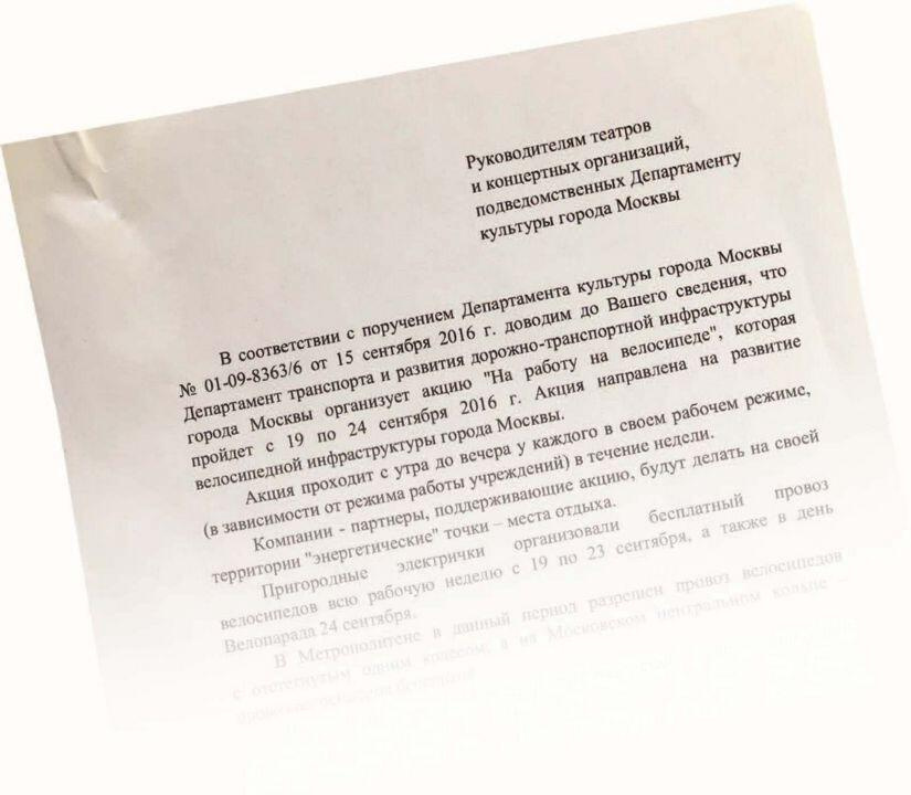 В соответствии с поручением Департамента культуры города Москвы 01-09-8363/6 от 15 сентября 2016 г. доводим до Вашего сведения, что Департамент транспорта и развития дорожно-транспортной инфраструктуры города Москвы организует акцию «На работу на велосипеде», которая пройдет с 19 по 24 сентября 2016 г. Акция направлена на развитие велосипедной инфраструктуры города Москвы.
