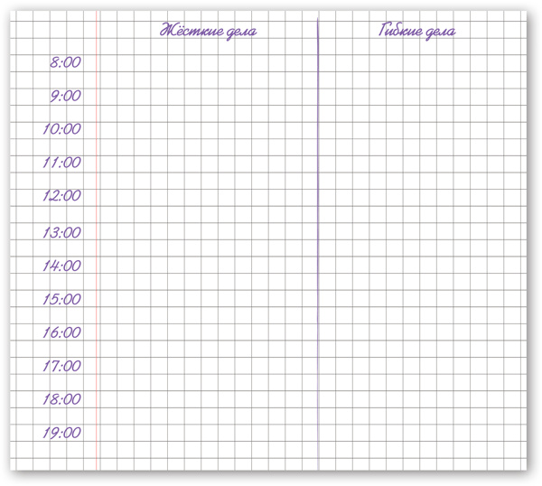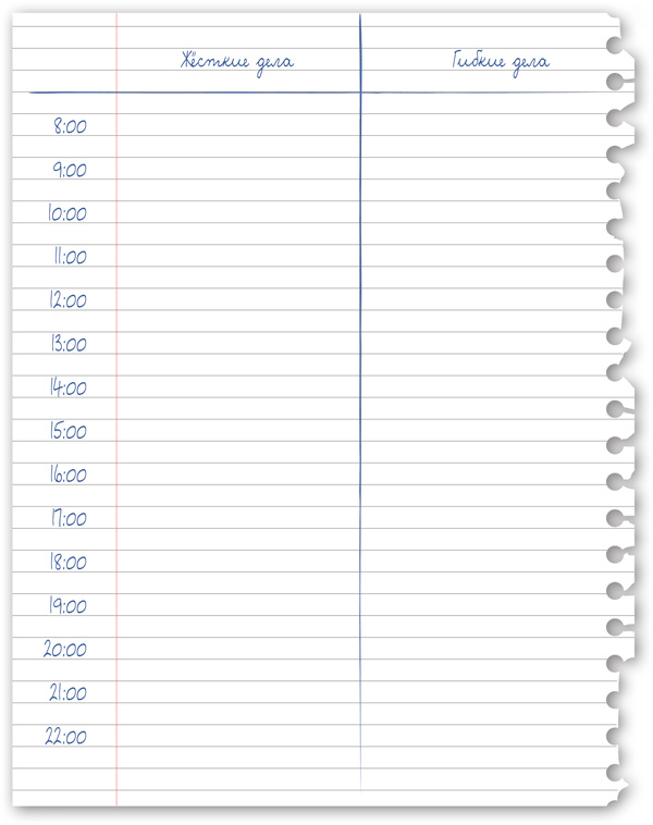На следующей странице ты видишь тетрадный листок, разделенный пополам. Составь список дел на завтра. Укажи слева жёсткие дела, а справа гибкие. Гибкие дела записывай с учётом их приоритета. Успехов!