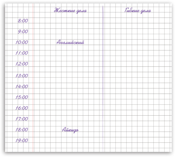 Вот по такой форме и планируется день, сообщила мама. Давай мы попробуем твой сегодняшний список дел спланировать правильно, учитывая жёсткость и гибкость каждого дела. Итак, сколько сегодня у тебя было жёстких дел?