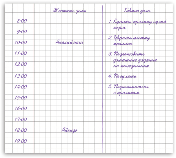 Мама, я не понял две вещи, сказал Федя. Первое как же теперь этот план выполнять? А второе зачем надо было две колонки делать? Разве нельзя было все задачи сделать «жёсткими»? Например, решить, что я с двух часов до трёх делаю уроки, потом с трёх до четырёх гуляю, затем с четырёх до пяти играю с кроликом. Разве так не проще?