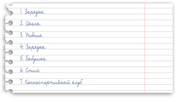 Я утром сделал зарядку и пошёл в школу. Там стал вспоминать, что означает слово «учебник» в моём списке, и решил, что надо было, наверное, какой-то учебник не забыть в школу принести. Так я вроде их все, какие нужны сегодня, принёс. Потом смотрю, слово «зарядка» записано, думаю, я, наверное, ошибся и два раза записал одно и то же не делать же мне эту зарядку дважды, тем более в школе. Пришел домой и стал смотреть, что у меня дальше по списку, смотрю «бабушка» написано. Это она меня хлеб просила купить по дороге из школы, а я, только когда она меня про этот хлеб спросила, сообразил, что к чему. Потом вроде стало всё понятно, я выучил стихотворение и стал собираться в конноспортивный клуб. В это время звонит Вася и спрашивает, где его учебник, который я у него на день вчера взял и сегодня отдать собирался. Вот тут-то я и понял, что на самом деле означало слово «учебник» в моём списке. А потом у меня телефон разрядился, и я вспомнил, что свой зарядник Лене Мечталиной отдал, а забрать забыл. Оказывается, вот что моя «зарядка» то вторая означала: это зарядник оказался.