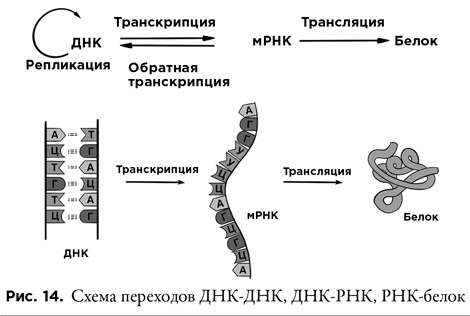 Ученые, открывшие структуру ДНК, продолжили изучать передачу генетической информации как при появлении новой клетки, так и в процессе жизнедеятельности старой. В 1958 году Фрэнсису Крику удалось сформулировать основную догму молекулярной биологии. Ученый установил, что генетическая информация в клетке удваивается в процессе репликации ДНК: молекула «расплетается», и каждая цепочка комплементарно достраивается вновь. Затем с ДНК снимается «копия» в виде одноцепочечной рибонуклеиновой кислоты (РНК) этот процесс называется транскрипцией. Наконец, в ходе трансляции в рибосомах (специальные органеллы в клетке) по «инструкции», содержащейся в РНК, из аминокислот собираются белки.