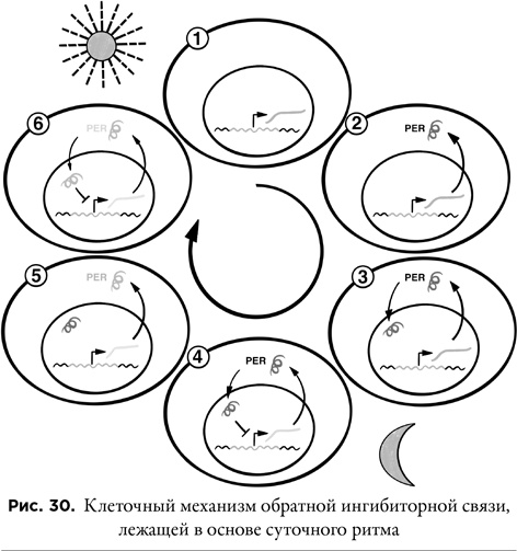 Здесь изображена последовательность событий во время 24-часового цикла. Когда ген PER активен, производится мРНК. Она транспортируется в цитоплазму клетки и служит в качестве шаблона для производства PER-белка. Белок накапливается в ядре клетки, и активность гена PER снижается. Это порождает механизм ингибиторной обратной связи, которая лежит в основе суточного ритма.
