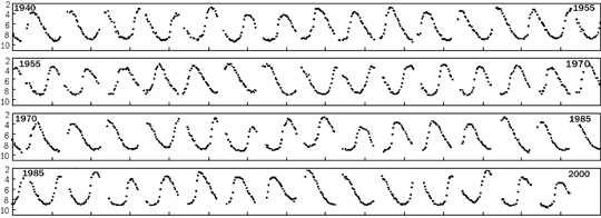 На рисунке показана кривая блеска (в звездных величинах) переменной звезды Мира Кита (ο Cet), полученная по наблюдениям астрономов многих стран за 60 лет. Почему в некоторых местах этой кривой отсутствуют наблюдательные точки?
