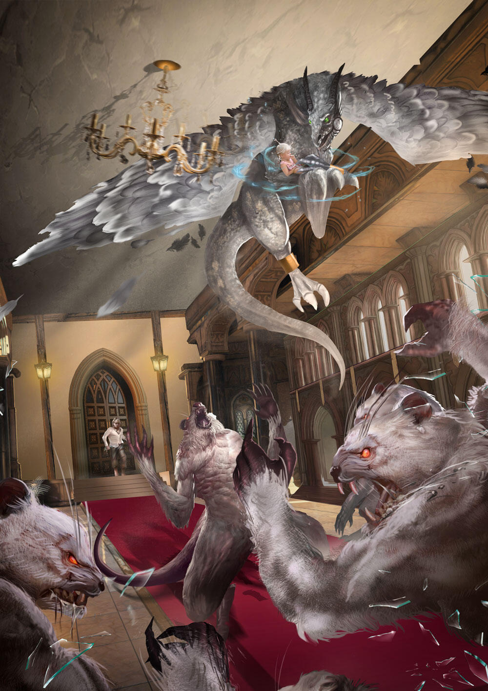 Странный, страшный сон приснился мне сегодня, малышка, шепотом сказал Армариус и, тяжело вздохнув, подошел к большому окну, расположенному на север. Только он собирался впустить солнечный свет, как заметил через узкую щелочку между тяжелыми тканями какое-то движение на веранде. Он отпрянул назад и, затаив дыхание, слегка приоткрыл занавес. Ужас отразился в его глазах, и уже через мгновение, схватив Одежавель прямо с колыбелью, он взлетел под самый купол залы. Мелодично зазвенели хрусталики на потревоженной его крыльями люстре, и к мелодии хрусталя добавился звон рассыпающегося на мелкие осколки оконного стекла. Армариус увидел, как всю комнату заполонили странные огромные существа. Они сильно напоминали варканов, живущих в лесах Заоблачности, только эти особи были гораздо крупней. Их пасти были перепачканы серебристой кровью. Они озирались, вращая своими огромными глазами, пытаясь найти обитателей залы.
