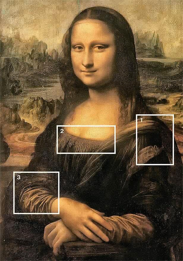 У Джоконды есть головной убор, хотя на первый взгляд это незаметно, легчайшая черная вуаль. Как сумел Леонардо сделать настолько прозрачной вуаль, которую обычно считают знаком траура, хотя, возможно, она является символом материнства? Эффект достигнут благодаря применению масляной краски с крошечной примесью цветного пигмента.