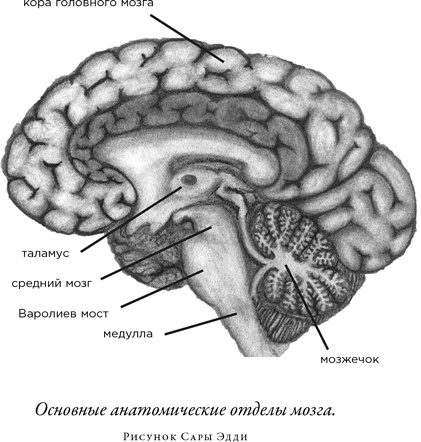 Уиллис, будучи английским врачом, провел бесчисленное множество вскрытий, что позволило ему прояснить в значительной степени анатомию мозга. Он выяснил, что в структуре мозга можно выделить три основных компонента: cerebrum, cerebellum и brainstem. Внешняя часть большого мозга (cerebrum) называется cerebral cortex (кора головного мозга), или просто корой, и содержит в себе нервные клетки, или нейроны, вовлеченные в высшую нервную деятельность: это «серое вещество» мозга. Пирамидные, или корково-спинномозговые, пути представляют собой нервные волокна, по которым сигналы от коры мозга передаются к его стволовой части и спинному мозгу, тогда как таламус передает информацию от органов чувств к коре мозга. Мозжечок, который лежит ниже и сзади по отношению к большому мозгу, участвует в координации мышечных движений и специфичных вариантов поведения, таких как поза и равновесие. Стволовая часть мозга, которую можно, в свою очередь, разделить на средний мозг, Варолиев мост и продолговатый мозг, отвечает за автоматические функции тела, такие как дыхание и сердечная деятельность.