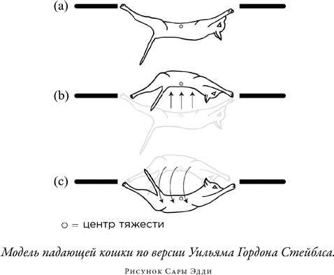 «Почему кошки всегда падают на лапы? На этот вопрос на самом деле совсем не сложно ответить. В начале падения с высоты внизу находится спина кошки, выгнутая полукругом. Если бы кошка так и упала, то перелом позвоночника и смерть стали бы неизбежным результатом падения. Но природный инстинкт побуждает ее, после того как она пролетела один-два фута, внезапно сократить мускулы спины и вытянуть лапы; теперь уже живот ее выгибается, а спина становится вогнутой, что меняет центр тяжести и переворачивает тело; после этого кошке, чтобы приземлиться на лапы, остается только удерживать себя в этом положении»{3}.