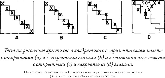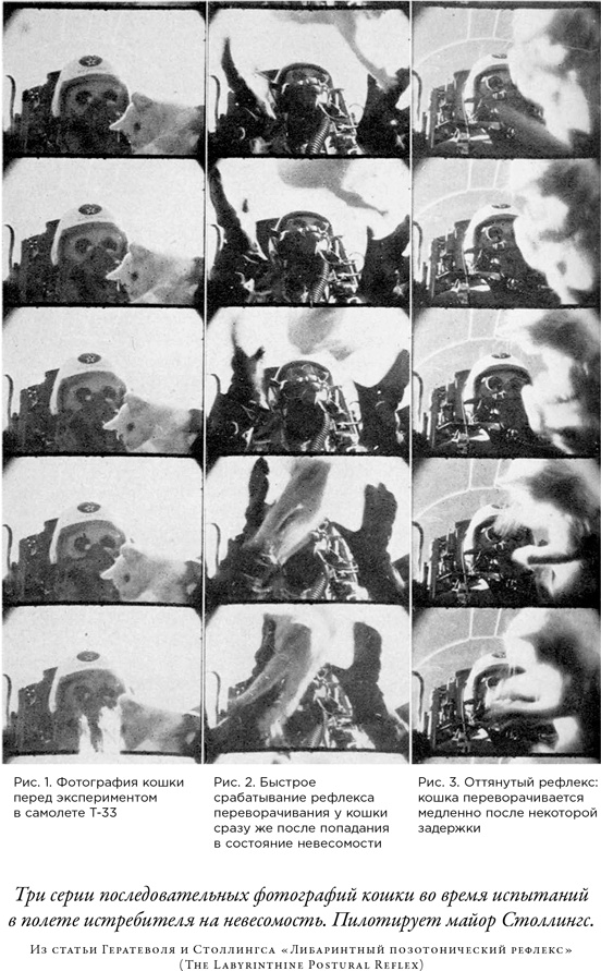 Один тревожный вопрос о невесомости по-прежнему оставался нерешенным: как будет чувствовать себя человек в невесомости, если его не пристегивать к креслу или какой-то другой закрепленной опоре? Исследователи тогда еще не использовали для испытаний в невесомости больших грузовых самолетов. Приходилось действовать иначе и брать для испытаний и животных, и самолеты поменьше. В экспериментах с невесомостью участвовали восемь кошек: четыре котенка в возрасте около трех недель, две двухмесячные и две трехмесячные кошки. Не все животные чувствовали себя в невесомости одинаково хорошо. Самые юные кошечки и котики не проявляли рефлекса переворачивания вовсе, из чего исследователи сделали вывод, что этот рефлекс у кошек формируется между четвертой и шестой неделями жизни.