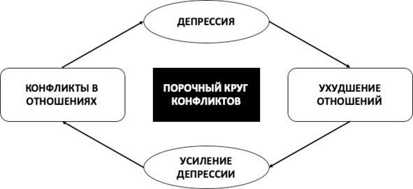 Конфликты и неудовлетворённость в отношениях могут быть одним из факторов, способствующих депрессии, но в то же время сама депрессия может быть источником конфликтов и неудовлетворённости в отношениях (см. рис. 17).