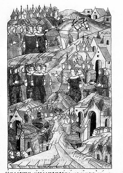 Взятие Рязани монголами. Миниатюра из «Лицевого свода». XVI в. Библиотека Российской академии наук, Санкт-Петербург