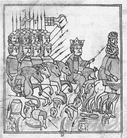 Сказание о Мамаевом побоище. Отступление войска Мамая под натиском вступившего в сражение засадного отряда русских воинов. Миниатюра из «Лицевой рукописи». XVII в. Государственный исторический музей, Москва