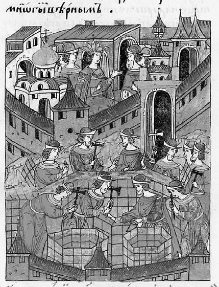 Строительство храма Василия Блаженного. Миниатюра из «Лицевого свода». XVI в. Библиотека Российской академии наук, Санкт-Петербург