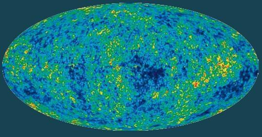 Первая «карта» Вселенной, или микроволновое реликтовое излучение, около 14 миллиардов лет назад. Карта отображает колебания температуры в разных точках Вселенной через 380 000 лет после ее рождения, которые соответствуют местам зарождения будущих галактик. С момента экспериментального подтверждения существования реликтового излучения в 1964 году оно изучается с помощью приборов, установленных на спутниках или в люльках под аэростатами. Приведенная здесь первая детальная карта построена по данным со спутника Wilkinson Microwave Anisotropy Probe