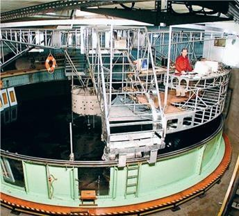 Для решения проблем механики у исследователей есть выбор между двумя методами. Астрономы чаще всего предпочитают невращающуюся систему координат, установленную относительно самых далеких, условно неподвижных звезд. Другой метод состоит в том, чтобы использовать систему координат, связанную с Землей, что обязывает вводить мнимые силы: силу Кориолиса и центробежную силу. Так поступают в метеорологии: неудобство несущественно, ведь большую часть сил (вес, трение и т. д.) было бы слишком трудно учитывать в системе отсчета, связанной со звездами. И все же не всегда легко принимать в расчет силу Кориолиса в вычислениях, поэтому необходимо проверять их опытным путем. В этом цель платформы Кориолиса, установленной в Гренобле. Это вращающаяся платформа диаметром 13 м, на которую устанавливаются бассейны различной формы и размеров, выдерживает вес вплоть до 300 т и совершает до четырех оборотов в минуту (илл. 10).