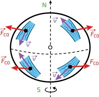 9. Cила Кориолиса FCO отклоняет течение рек к правому берегу в Северном полушарии и к левому в Южном