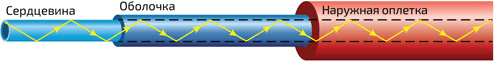 2. Распространение светового луча в оптоволокне. Передаваемый луч много раз отражается от границы между сердцевиной и оболочкой и таким образом направляется по волокну. Данные кодируются изменением интенсивности света