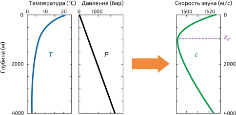 5. Пример изменения скорости звука с в океане в зависимости от глубины. В результате повышения давления и понижения температуры по мере приближения ко дну скорость достигает минимума на глубине zm, чаще всего около 1000 м