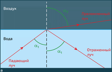 Преломление и отражение светового луча (красные стрелки), выходящего из воды (показатель преломления равен 1,33) в воздух (показатель преломления близок к 1,0)