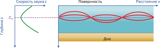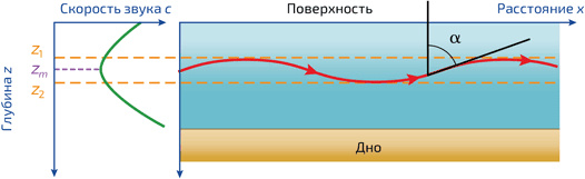 6. Акустический луч (красный), излучаемый на глубине zm, проходит между двумя плоскостями, от которых он полностью отражается. Зависимость скорости звука от глубины c (z) в океане представлена зеленой кривой. Значения z1 и z2 (считаем, что глубина равна 0 на поверхности) зависят от угла падения луча на глубине zm и определяются законом Снеллиуса: c (z1) = c (z2) = cm/sin α (zm)