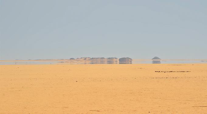 8. Пример миража в Ливийской пустыне. По мере приближения к раскаленному песку солнечные лучи встречают все более горячий воздух (и, следовательно, среду с уменьшающимся показателем преломления): таким образом, они, как и звуковые лучи на илл. 7, все сильнее отклоняются вплоть до отражения. Наблюдателю кажется, что в продолжении этих отраженных лучей он видит воду