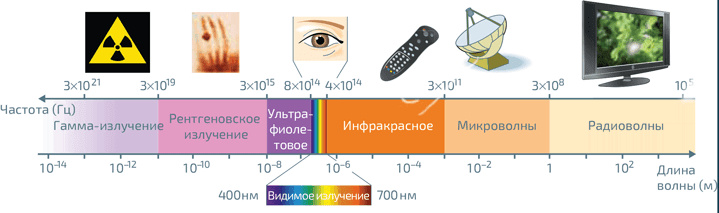 Цветовое зрениеРазличные области электромагнитного излучения и их применение. Узкая область между 400 и 800 нм (то есть на частотах между 800 и 400 ТГц) соответствует видимому спектру. Каждое излучение, или «спектральный цвет», обладает своей длиной волны λ, которая связана с частотой υ отношением λ = c/υ, где c скорость света в вакууме