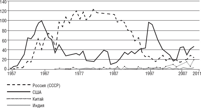 На этом графике видно, что пик космических проектов в России пришелся на период между 1970 и 1991 годами. В Советском Союзе ежегодно запускали около ста космических аппаратов. Позже это число резко сократилось: Россия успешно запустила только 214 ракет в течение первого десятилетия XXI века, то есть в среднем больше 21 ракеты за год.