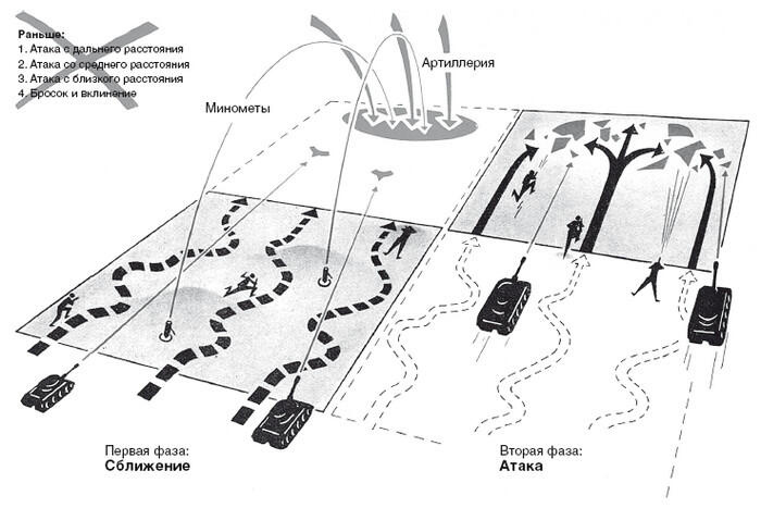 Подобные приемы, конечно, не могут служить панацеей и шаблоном для применения в любой обстановке. Зачастую при быстрой смене природных условий и рельефа местности будет использоваться метод «просачивания» или наступление «штурмом», а то и такой способ, в котором найдут отражение оба этих метода. Они охарактеризованы отдельно лишь для того, чтобы четче подчеркнуть разницу между ними.
