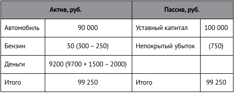 В течение первого дня работы своей фирмы Иван получил 1500 руб. выручки, при этом израсходовав 250 руб. на бензин, а также заплатив 2000 руб. за замену фары, случайно поврежденной в результате наезда на забор. Таким образом, расходы ЗАО «Кузя-такси» учета дневной амортизации автомобиля) составили 2250 руб., а убыток 750 руб. (1500 2250). Баланс ЗАО «Кузя-такси» на конец дня выглядит так: