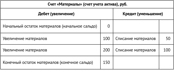 Бухгалтер вычитает эти суммы из стоимости поступивших материалов и определяет конечный остаток по счету, который называется конечное сальдо счета. Конечное сальдо счета равно 150 руб. Это означает, что на конец периода у организации имеются неизрасходованные материалы на сумму 150 руб.