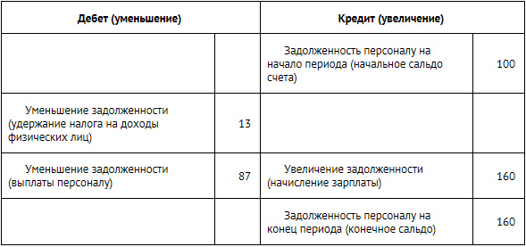 По дебету счета показаны две суммы 13 и 87 руб. Это налог на доходы физических лиц и выплата персоналу, которые бухгалтер учитывает со знаком «минус», поскольку они уменьшают задолженность фирмы перед персоналом.