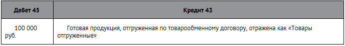 Если договором не предусмотрено иное, то право собственности на передаваемый по бартеру товар переходит к покупателю только после того, как продавец взамен получил от него другое имущество (ст. 570 ГК РФ). Следовательно, пока встречная поставка от контрагента не поступила, товар, отгруженный по бартеру, не считается проданным и учитывается на счете 45 «Товары отгруженные», т.е. в бухгалтерском учете выручки не возникает.
