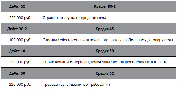 В текущем году ЗАО «Винни-Пятачок» и ОАО «Осел Иа» заключили договор мены, согласно которому «Винни-Пятачок» обязуется передать компании «Осел Иа» партию банок с медом собственного производства себестоимостью 100 000 руб. В обмен на переданную продукцию «Винни-Пятачок» получит от «Осла Иа» необходимые материалы. В обычных условиях «Винни-Пятачок» реализует такую партию за 220 000 руб. Для упрощения примера НДС игнорируется.