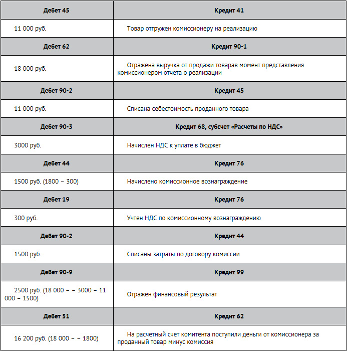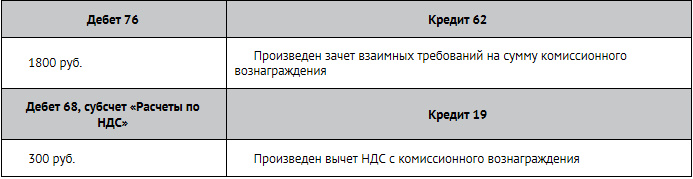Комиссионное вознаграждение установлено в размере 10% от стоимости проданного товара и равно 1800 руб. (в том числе НДС 300 руб.). Бухгалтер компании «Винни-Пятачок» сделал следующие записи:
