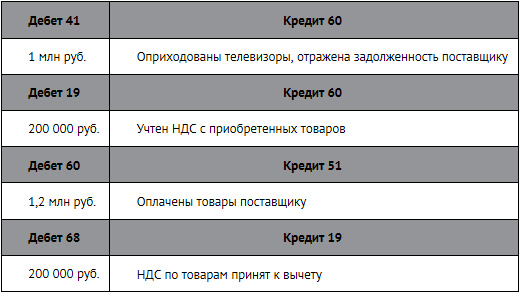 Магазин «Торговый дом кота Базилио» приобрел 10 плазменных телевизоров по цене 120 000 руб. за штуку (из них 20 000 руб. приходятся на НДС). Наценка на телевизоры составляет 30%, а ставка НДС, выплачиваемого магазином, равна 20%. В бухгалтерском учете делаются следующие проводки: