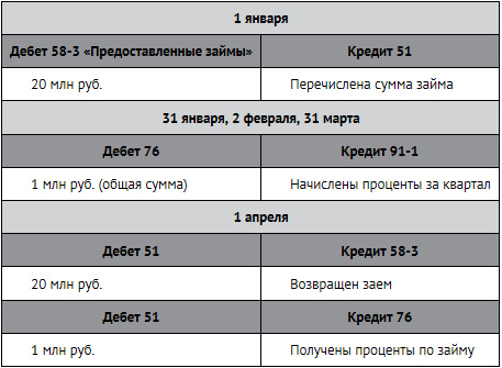 1 января текущего года ЗАО «Суперкастрюля» выдала рублевый заем в размере 20 млн руб. другой компании под 20% годовых. Заем и проценты по нему должны быть возвращены 1 апреля текущего года.