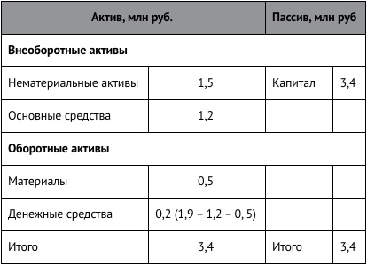 Теперь предположим, что фирма начала функционировать, а именно были закуплены оборудование на сумму 1,2 млн руб. и материалы стоимостью 0,5 млн руб. В результате данных операций структура баланса изменилась и приняла следующий вид: